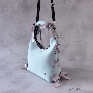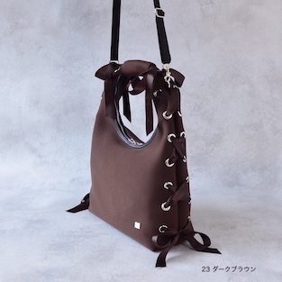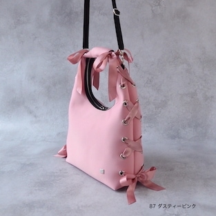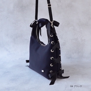 両サイドのアイレットと編み上げリボンがドラマチックな演出をするホーボーバッグ。